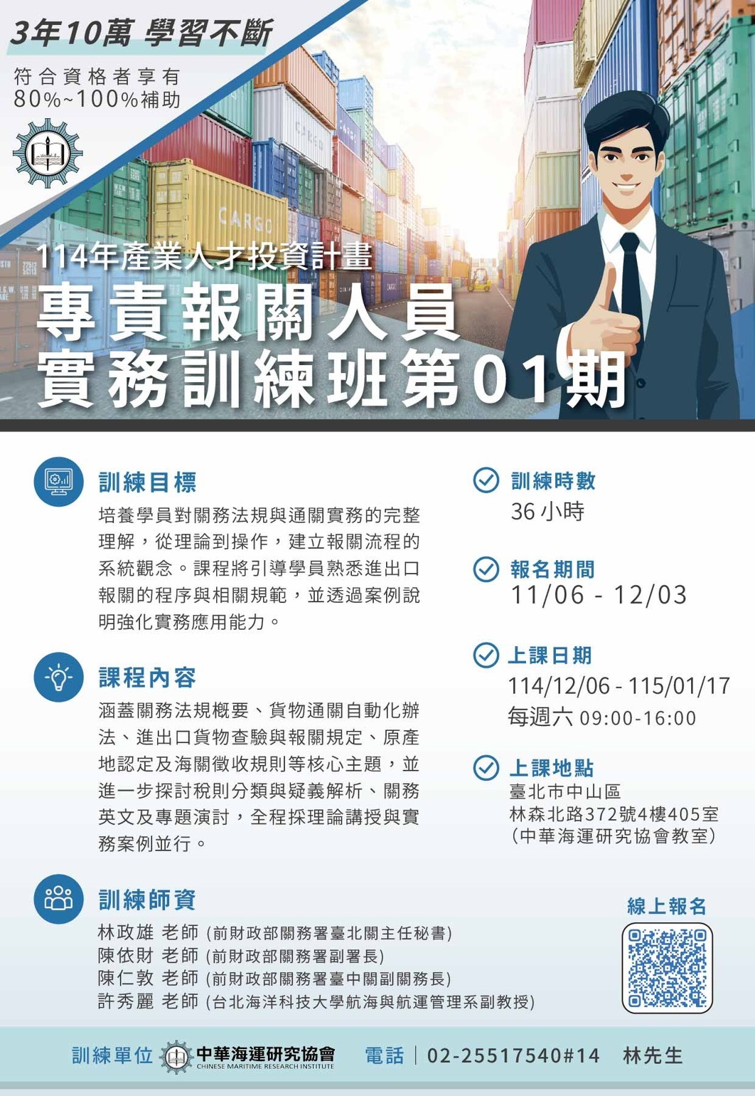 114年下半年產投課程「專責報關人員實務訓練班第01期」(即將開放報名)