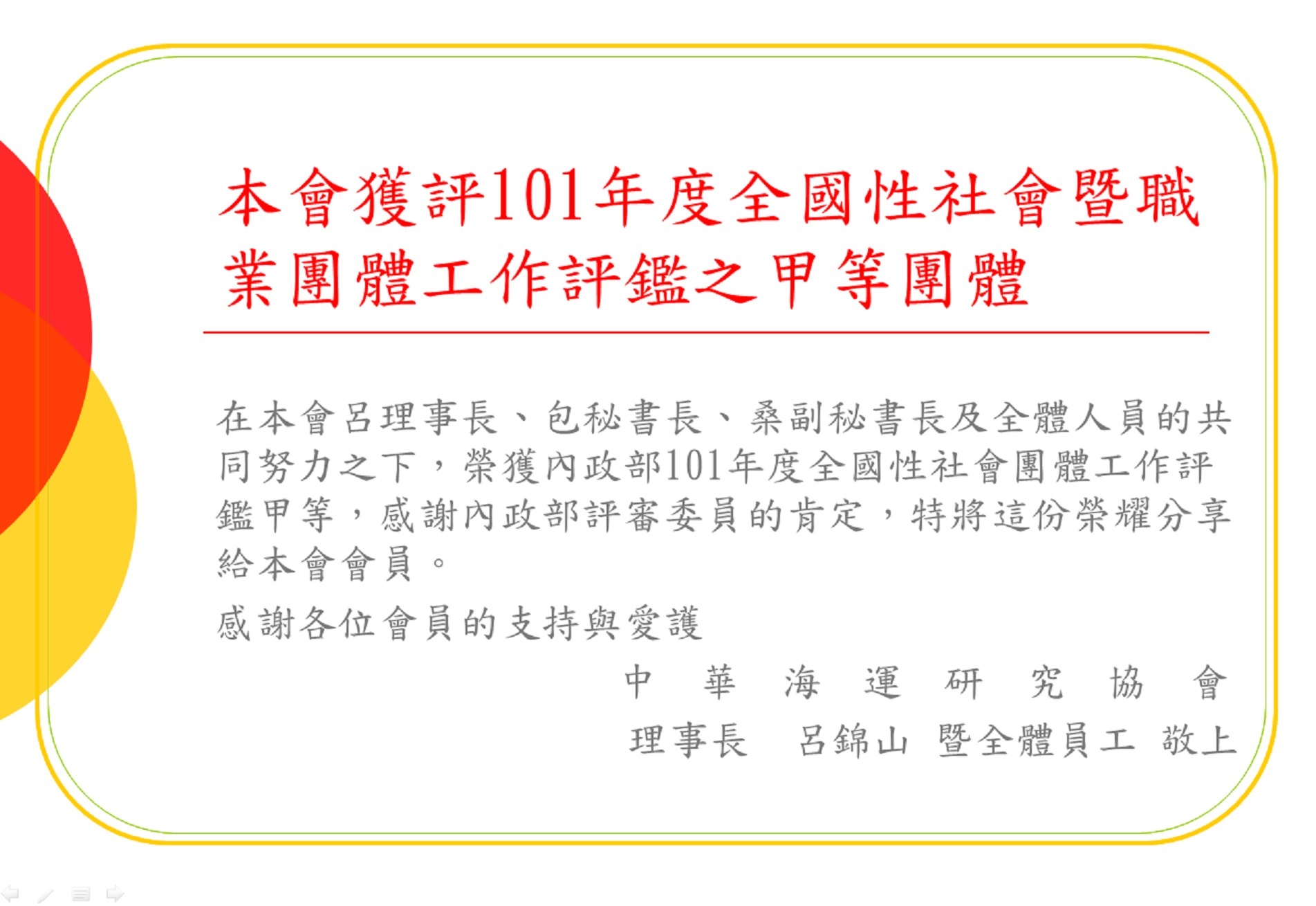 本會獲評為101年度全國性社會暨職業團體工作評鑑之甲等團體
